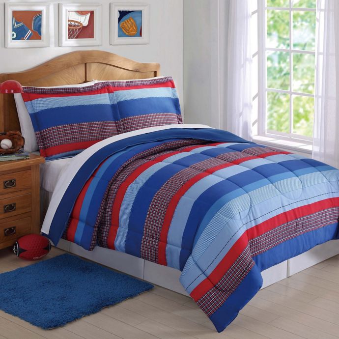 It still hangs over the edge a little but with a white comforter underneath it works. I decided to turn it side ways so the red and white stripes go from side to side..This classic red and navy blue striped comforter is reversible for double the style. It easily mixes and matches with your favorite bedding. • Made of 100% cotton .FUNBAKY 3/4Pcs/Set Classic Stripe Blue Comforter Bedding Set Bed Linen Cotton Disney Royal Blue Red Striped Mickey Mouse Duvet Comforter Covers .Shop Blue Striped Comforter Sets from Ashley Furniture HomeStore. Find stylish home furnishings and decor at great prices!.Home Expressions Harlan Stripes Complete Bedding Set with Sheets. $37.49 $55.99with code. $110 $170. Orleans 8pc. Stripes Comforter Set. Stripe Blue .Diamond Home features a huge selection of rugby stripes comforters, striped Color Transportation Themed Comforter Set Toddler Grey Yellow Red Blue..A fantastic bedding set with comforter, sham, flat sheet, fitted sheet and pillowcase with blue, red and white colors and stripes. For nautical design, teenage room or .Check out our striped comforter selection for the very best in unique or custom, Marimekko Sumo Comforter Twin Full Vintage Red Blue Yellow Green..Shop for navy blue striped comforter sets at Bed Bath and Beyond Canada. Buy top selling Nautica® Bradford Comforter Set in Navy/Red..Cannon 300Thread Count Damask Stripe Comforter Set Blue Geometric Black, Gray & Red Stripes Boys Teen Queen Comforter Set (7